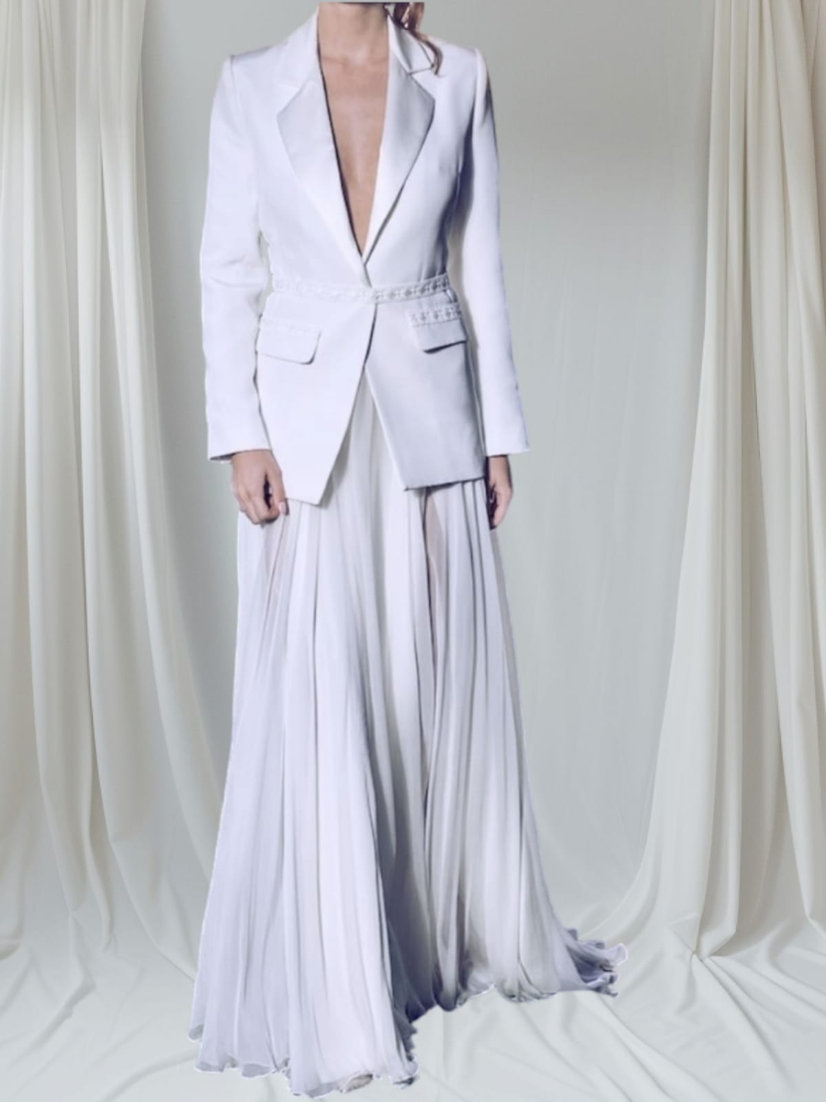 veste blezer femme décoré au niveau tour de ventre avec 2 poche & jupe longue femme élégante jupe
